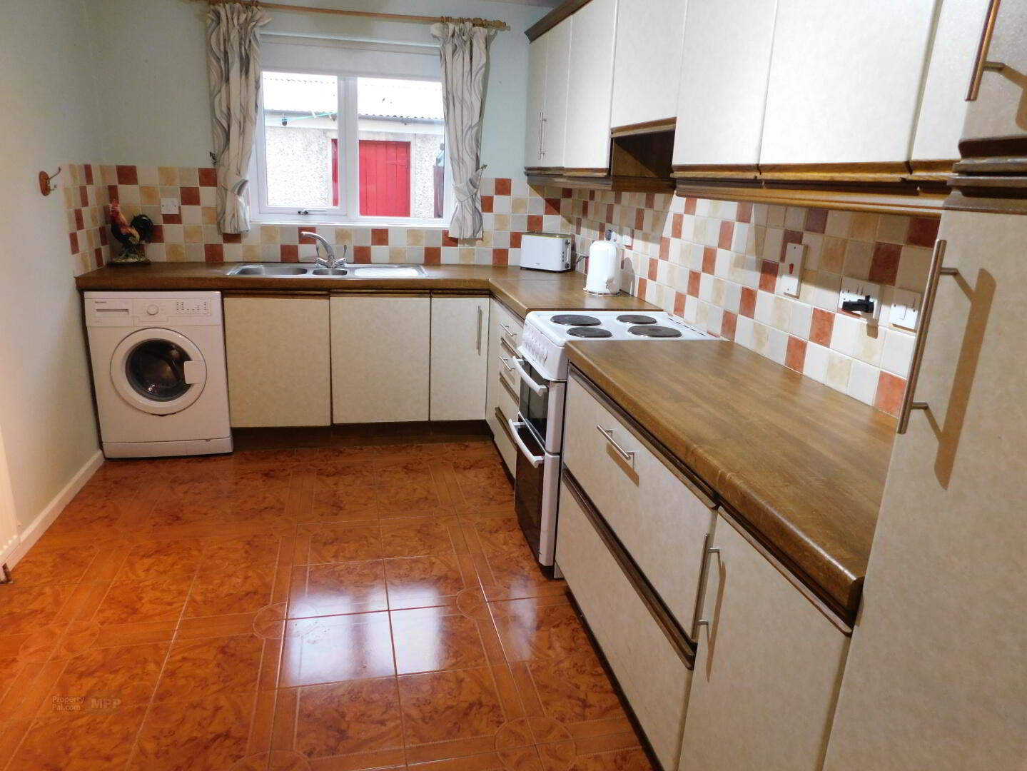 Kitchen: 15’ x 8’01” Cream High- and Low-Level Units, Extractor Fan, Freestanding Electric Cooker, Tile Flooring, Partially Tiled Walls, Plumbed for Washing Machine.