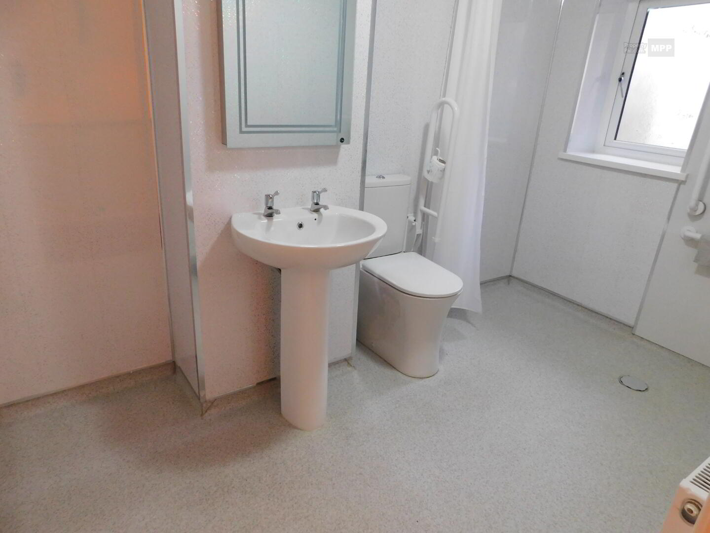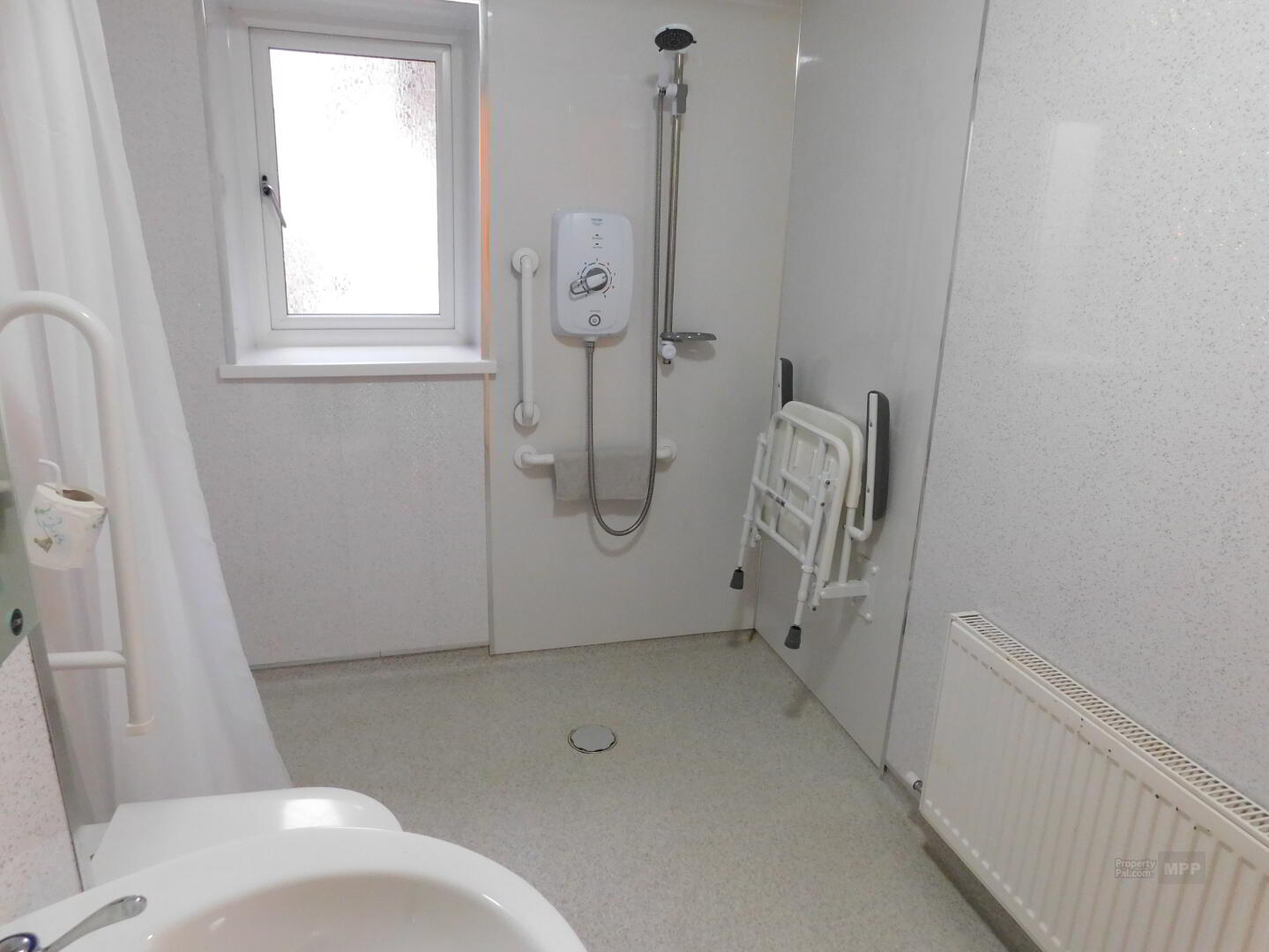 Bathroom: 10’02” x 6’01” White Suite, Wet Room Style Electric Shower, Non-Slip Vinyl Flooring, PVC Walls.