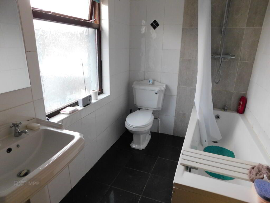 Bathroom: 8’03” x 5’06” White Suite, Bath with Shower Over, Tiled Flooring, Walls Fully Tiled, Heated Towel Rail.