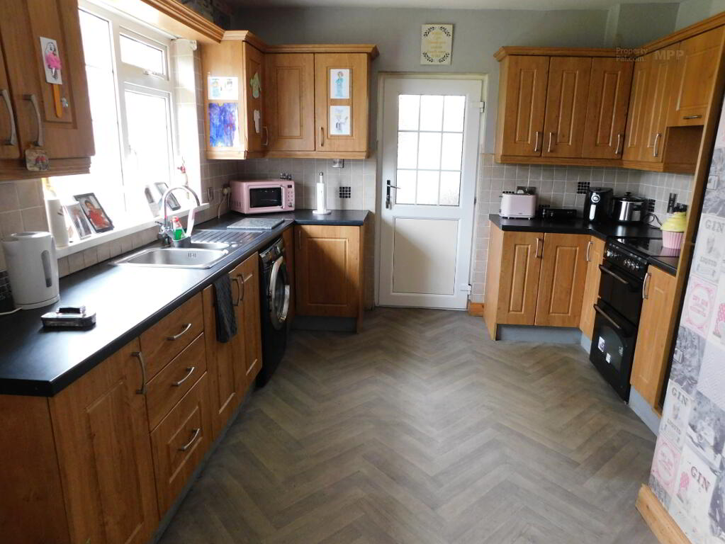Kitchen/Dinette: 17’10” x 10’11” Oak Effect High- and Low-Level Units, Extractor Fan, Plumbed for Washing Machine, Vinyl Flooring, Partially Tiled Walls, Downlights.