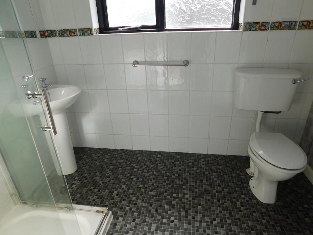 Bathroom: 5’04” x 7’11” White Suite, Electric Shower, Vinyl Flooring, Fully Tiled Walls.